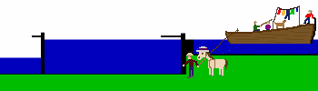 - When the lock is full, the upper miter gates are opened, and the canal boat enters.