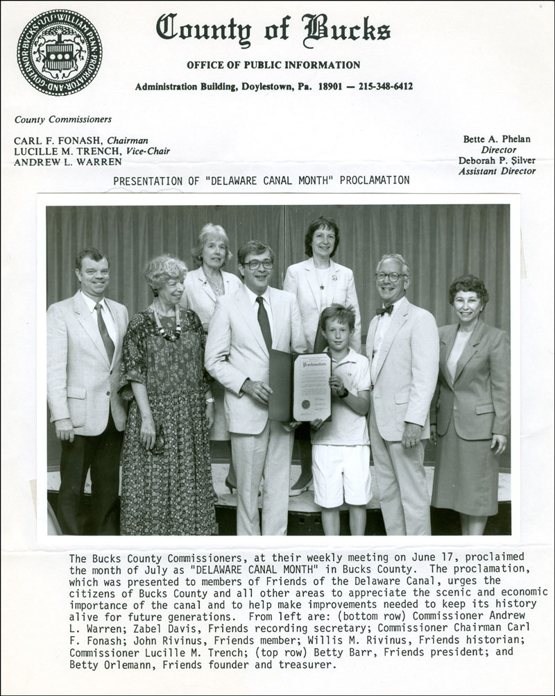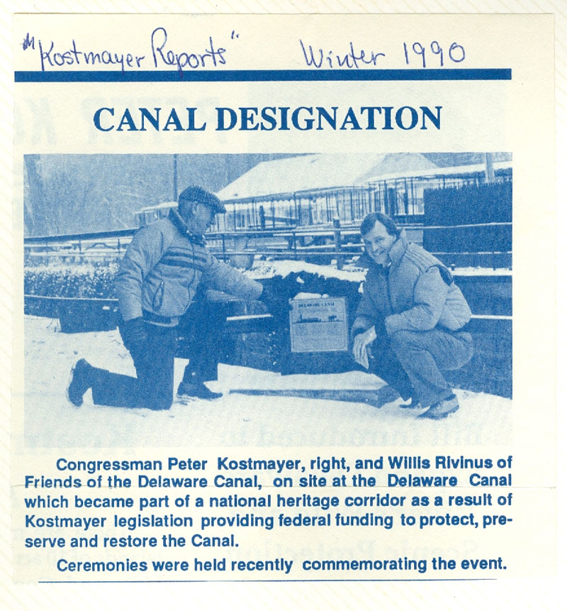 Virginia Forrest was there and became our first official member. Jim Greenwood also came, and was the first of many subsequent public officials to offer help to the ailing canal. Also in attendance was poet/sculptor Raymond Granville Barger, who read a poem dedicated to the Friends of the Delaware Canal. Congressman Peter Kostmayer came, and so did Superintendent Giza and Lance Metz, the Easton Canal Museum’s historian.