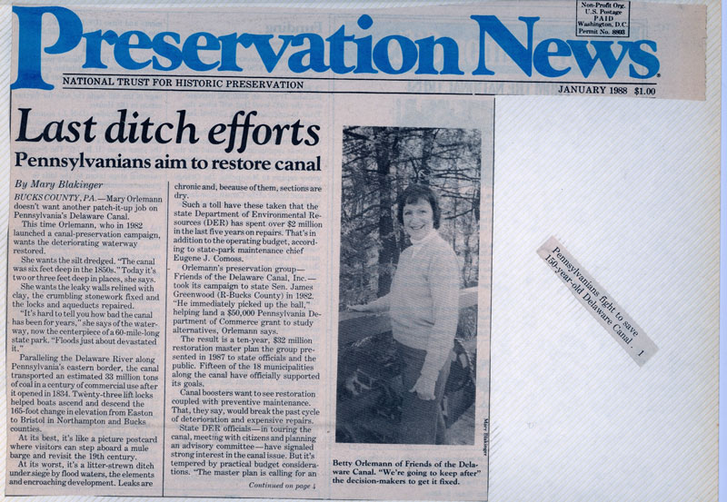 The following is a first-person account of the founding of the Friends of the Delaware Canal by its founder, Betty Orlemann.