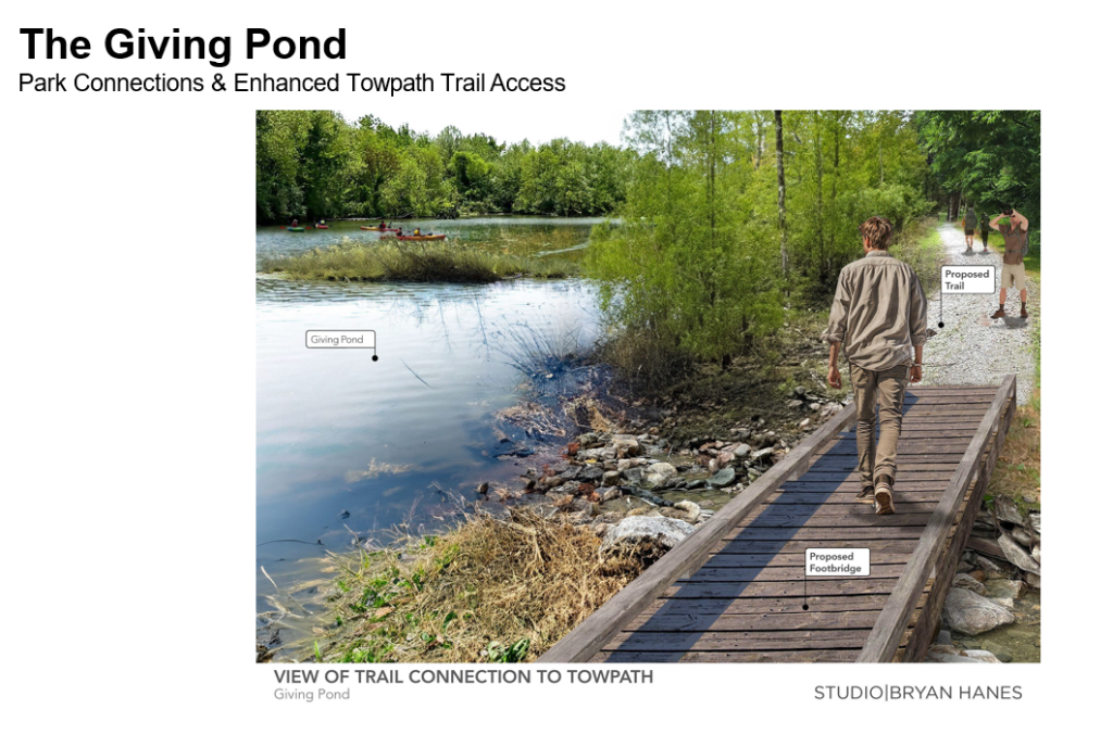 • At the Giving Pond, the plan establishes connections between the Delaware Canal State Park and the pond. The Friends looked at trail connections and the feasibility of pathways and new connections to the heart of the park.